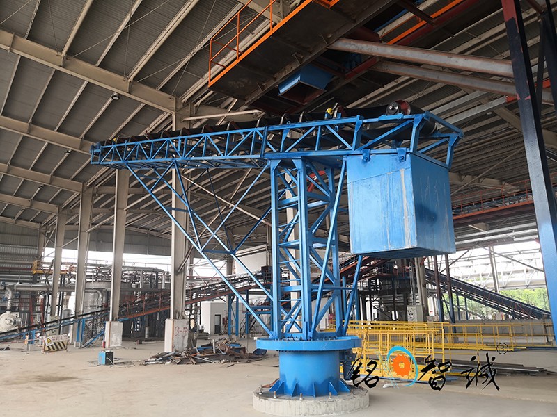 旋轉(zhuǎn)式皮帶輸送機(jī),為散碎物料倉(cāng)貯輸送設(shè)備,是在安裝有行走輪的支架上部的底盤上安裝一轉(zhuǎn)盤,轉(zhuǎn)盤可相對(duì)底盤作旋轉(zhuǎn)運(yùn)動(dòng),皮帶輸送機(jī)的進(jìn)料端座在轉(zhuǎn)盤頂部的托盤上,出料端為懸臂式,配重箱在托盤上用以上與懸臂配重,倉(cāng)貯時(shí),物料通過(guò)料斗由輸送帶送至遠(yuǎn)端,推動(dòng)懸臂即可改變堆積位置,在庫(kù)房?jī)?nèi)實(shí)現(xiàn)多點(diǎn)堆積而勿需停機(jī)和移動(dòng)機(jī)體,連續(xù)作業(yè)省時(shí)省力,操作方便,尤其適用于糧食的倉(cāng)貯輸送。